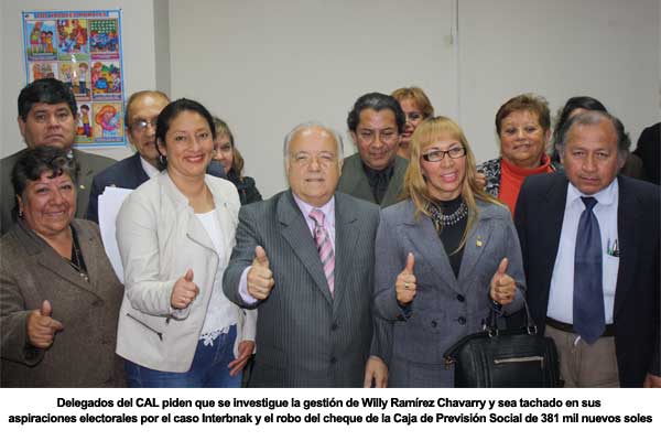 La Coordinadora de Delegados por unanimidad exigió moralización y que se esclarezca la gestión del Director de Economía del 2013, Willy Ramírez Chavarry, que de conformidad al Artículo 29 de los Estatutos del CAL era el responsable de la gestión económica y logísitica del gremio y en su gestión en la Caja de Previsión Social se robaron un cheque de 381 mil nuevos soles y hoy no hay nadie en la cárcel y no se ha recuperado el dinero, hubieron actos de deshonestidad con la pérdida de muchísimos miles de soles imputables a los dependientes de Willy Ramírez Chavarry, Sr. Oscar Eduardo Cornejo Pérez y José Alberto Rivas Huayanay y hasta la fecha no se saben los resultados de las denuncias penales, no obstante que el mismo ex Director de Economía cuestionado en la sesión ordinaria del 27 de marzo de 2013 informó de estos actos de deshonestidad de 2 trabajadores de la oficina de Contabilidad y Fiananzas que dependía del Director de Economía, en consecuencia, se tienen que esclarecer estos hechos y el Contrato Interbank que es lesivo a los intereses de 68 mil agremiados y que fue propuesto, ejecutado y firmado por Willy Ramírez Chavarry, quien lógicamente, dijeron los delegados, será tachado en su aspiración electoral para que se le investigue en el Consejo de Ética y el Tribunal Electoral que preside la Dra. Flor Rosa Romero tendrá la responsabilidad histórica de apartar del proceso electoral a personas que pasaron por la Dirección de Economía del CAL y todavía no se ha investigado en el Poder Judicial a los presuntos responsables, habida cuenta que el empleador es responsable por los hechos de sus dependientes.