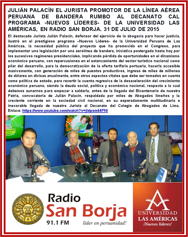 Julián Palacín el Jurista Promotor de La Línea Aérea Peruana de Bandera Rumbo Al Decanato CAL programa -Nuevos Líderes- de la Universidad Las Américas, en Radio San Borja. 31 de Julio de 2015